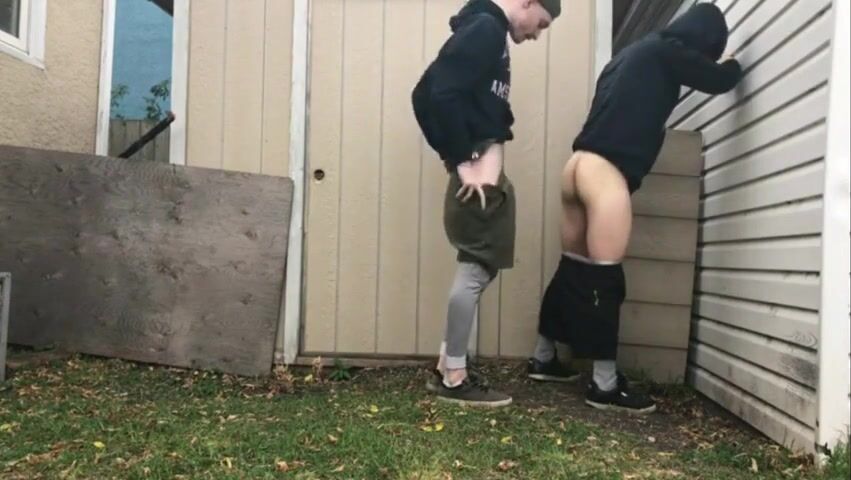 Two students hook-up on the street and sneak off to a backyard for a quick fuck