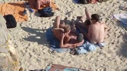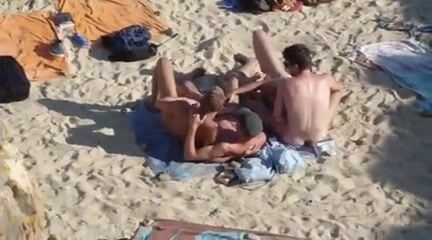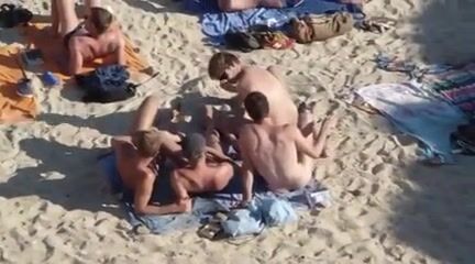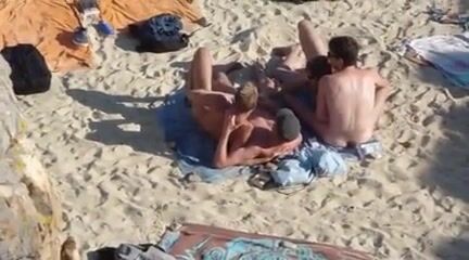 4 guys playing on nude beach