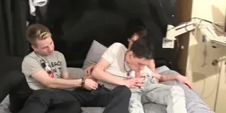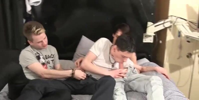This bottom boy can't get enough so, after being the 'middle man' in a fuck train, he takes 2 cocks at once, ending with loads of cum all over these hot boys!