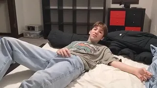 Watch as Cute Camboy pleasures himself with a massive cock while lying on his bed ...