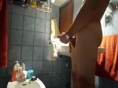 A smooth ripped twink jacks his big cock and cums like a cannon, you can hear the cum splatter against the wall