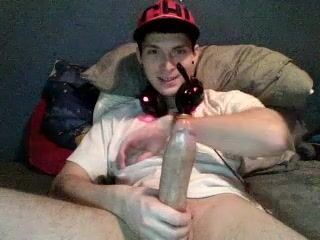 Watch as Cute Camboy pleasures himself with a massive cock while lying on his bed ...